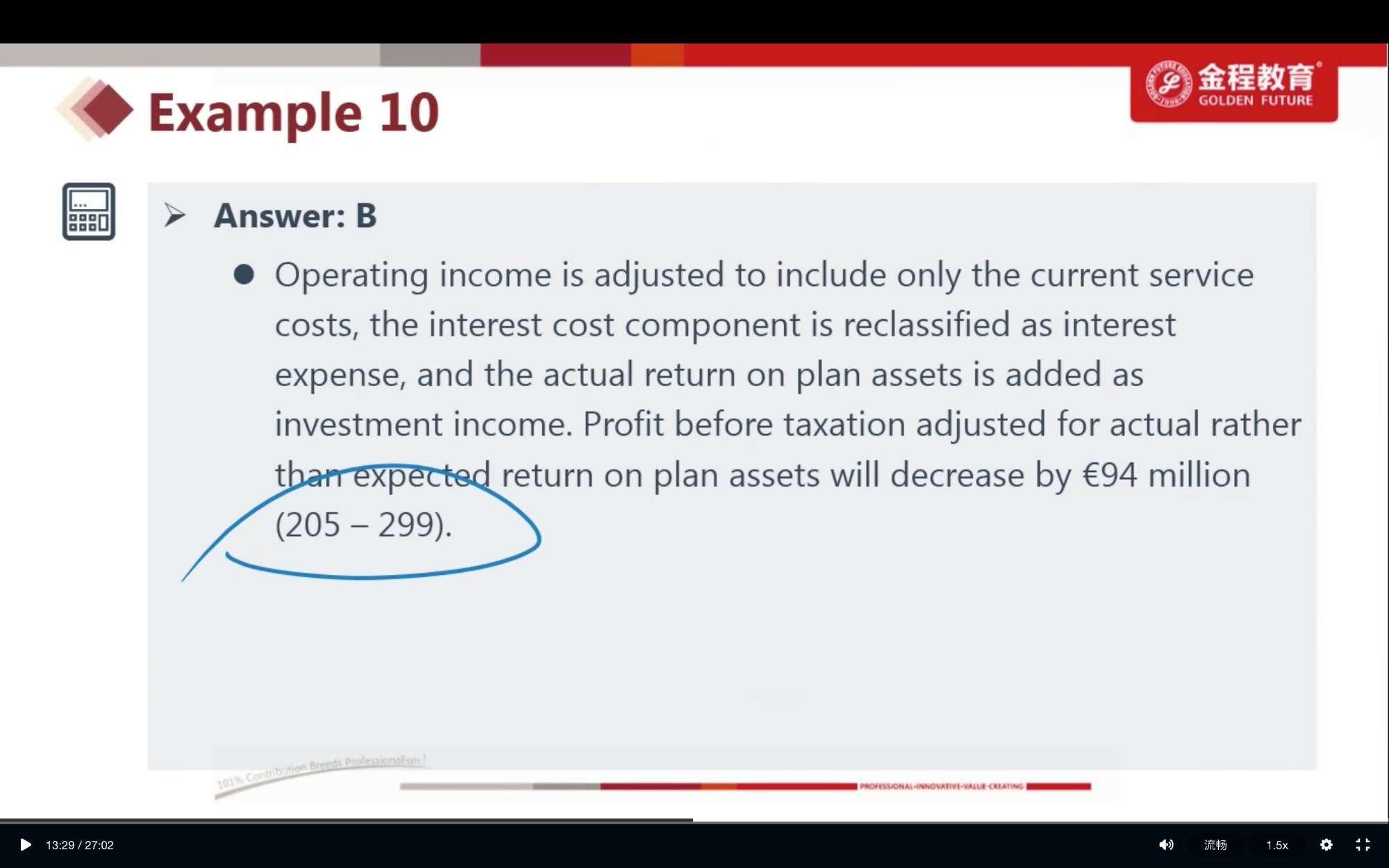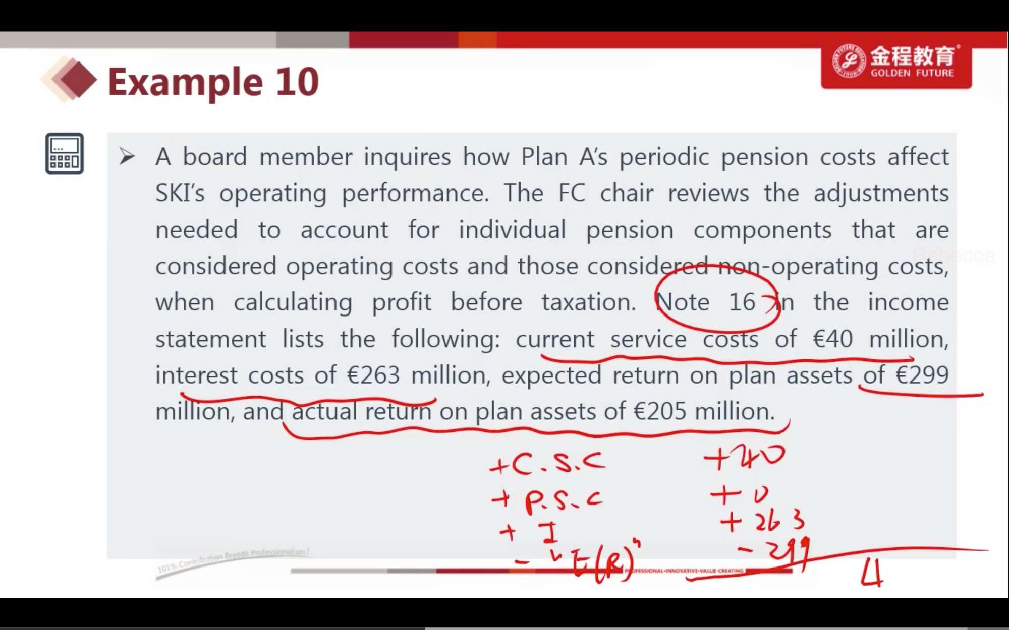 Nataile Holmstead 的答案不矛盾嘛?如果说工资增长率的变动是actuarial gain的话,此题是IFRS,那么变动进入OCI,不影响periodic pension cost.那么第4题就不对了。如果说工资增长变动影响PBO的value,继而会影响 service cost和interest cost,所以periodic pension cost下降 那么第5题的A和C不也是对的?