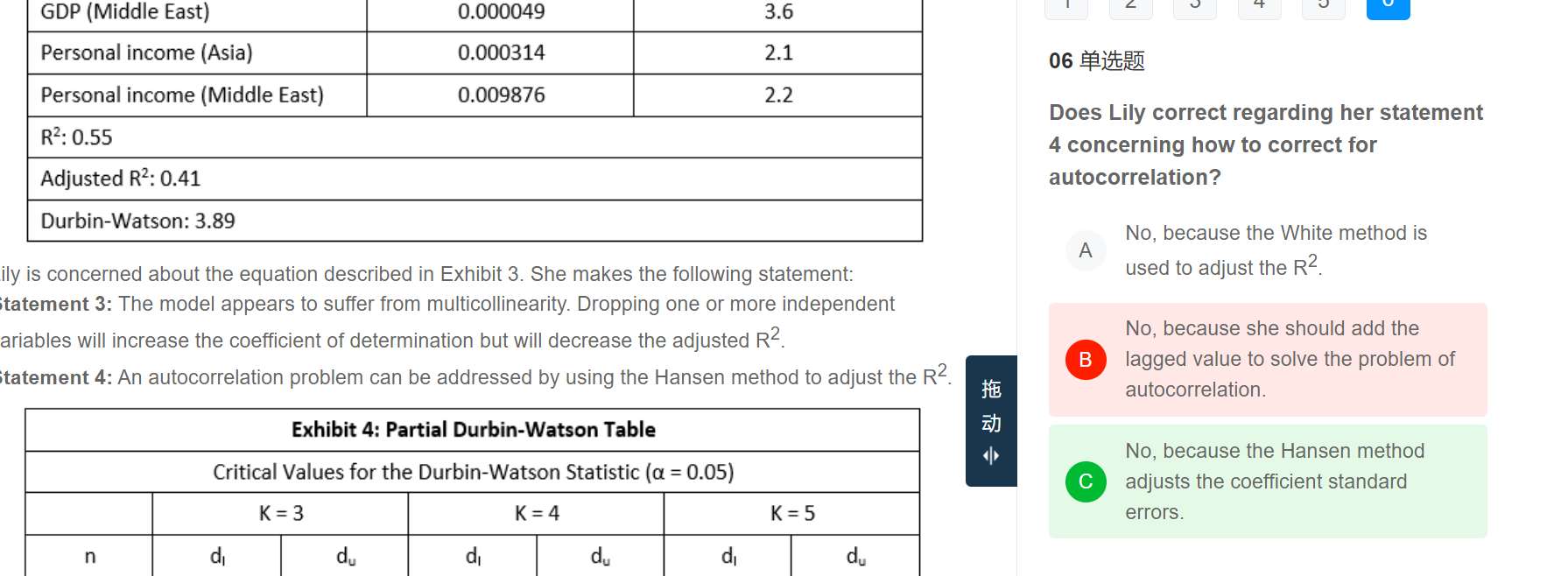 这道题不选B的原因应该是添加滞后项,是因为有季节性,而不是AR模型的问题,但是我记得之前在季度销售的多元回归里面,只选取3个季度的数字,因为选4个季度会出现多重共线性对吧?但是AR模型就是可以用过去的自己解释现在的自己,说明自变量之间是有关系的。这中间是否应该区别来看呢?
