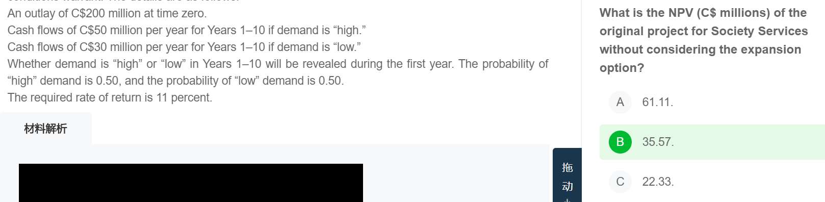已回答老师,这道题如果问的是计算行权的价值,思路是不是这样的:1.题目给出第二年行权情况下的现金流,这样可以判断是否行权。2.选择行权后正NPV的价值。3.行权的价值+正常价值就是期权行权后的总价值。