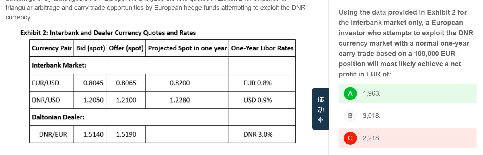 老师,这题carrytrade我这个算法为什么算不出答案:1.1年后的即期汇率DN/EU=1.4976,如此可判断出EU是贬值的。2.借100kEU@0.8%=800EU。3.100K*1.4941*3%=4482是投资收益,换成DN=4482/1.4976=2992。4.2992-800。我看思路和答案是一样的,只不过答案在投资过程中加入了本金。