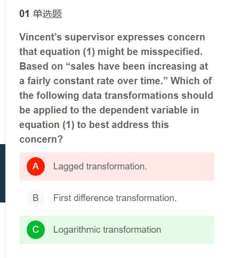 老师,请问这里第一题中只要是increasing at constant rate over time 就是选logarithmic transformation吗?那么剩下的两个lagged transformation 和 first difference transformation 是什么情况下才对的?谢谢老师。