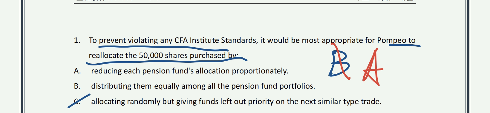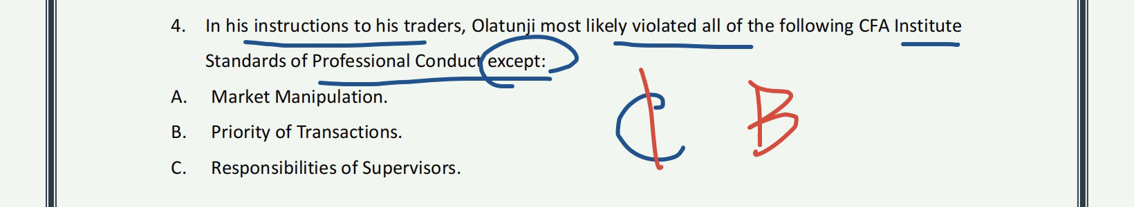 查看试题 已回答百题case4第四题,olatunji先给bashar的账户买入了股票,这个不属于违反priority of transaction吗?c选项错误是因为他让他们公司的trader利用MNI交易吗?