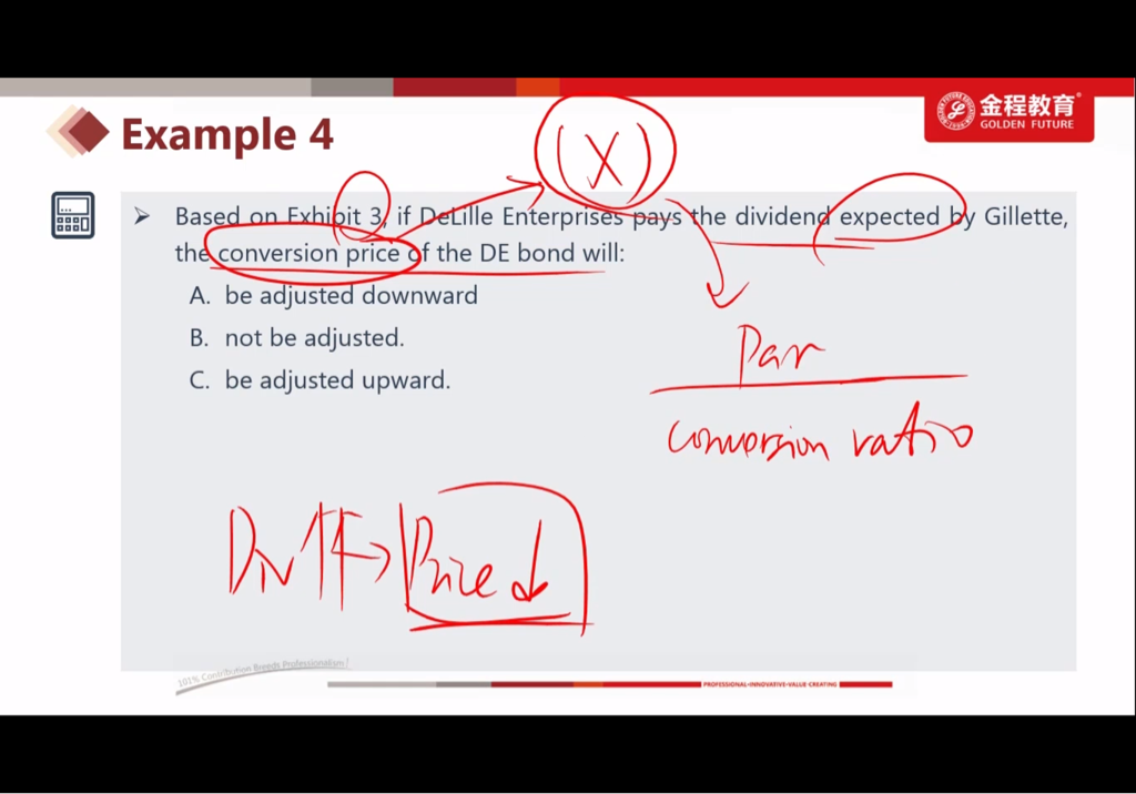 已回答Conversion-price等于par除以conversion ratio,发放股利肯定不会影响par吧,那是如影响conversion- ratio的,从而使最后的conversion- price下降的?