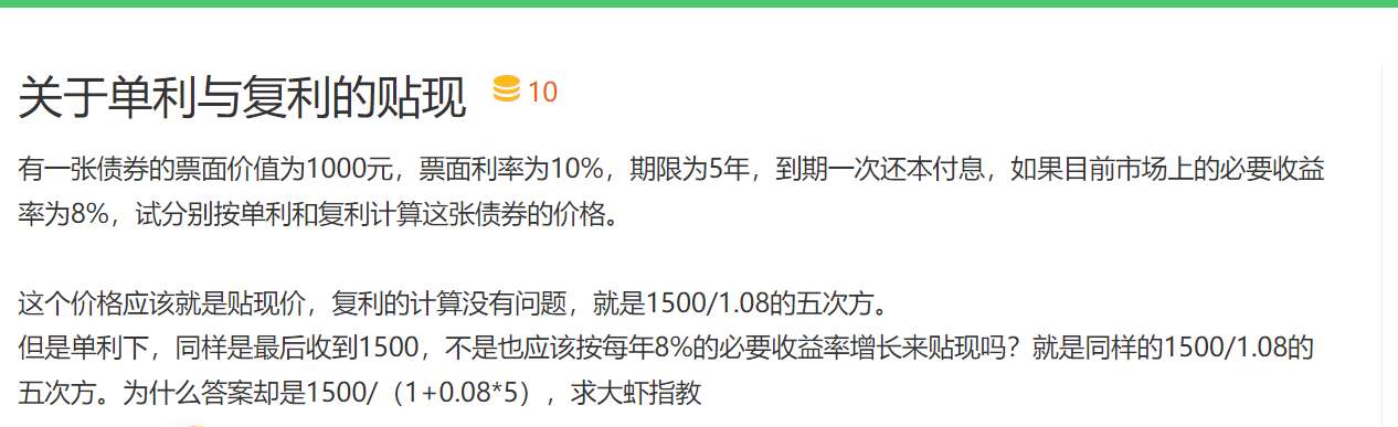 1.零息债券复利计算不应该市分子也是复利?1000*((1+10%)^5)/((1+8%)^5),而不是1500/(1.08^5) ?2.不满一年到期的零息债券现值为什么不是M(1+t/360*r),截图中的是复利计算的吗?零息债券不满一年到期复利现值不应该是PV=par/((1+r/t)^t)?