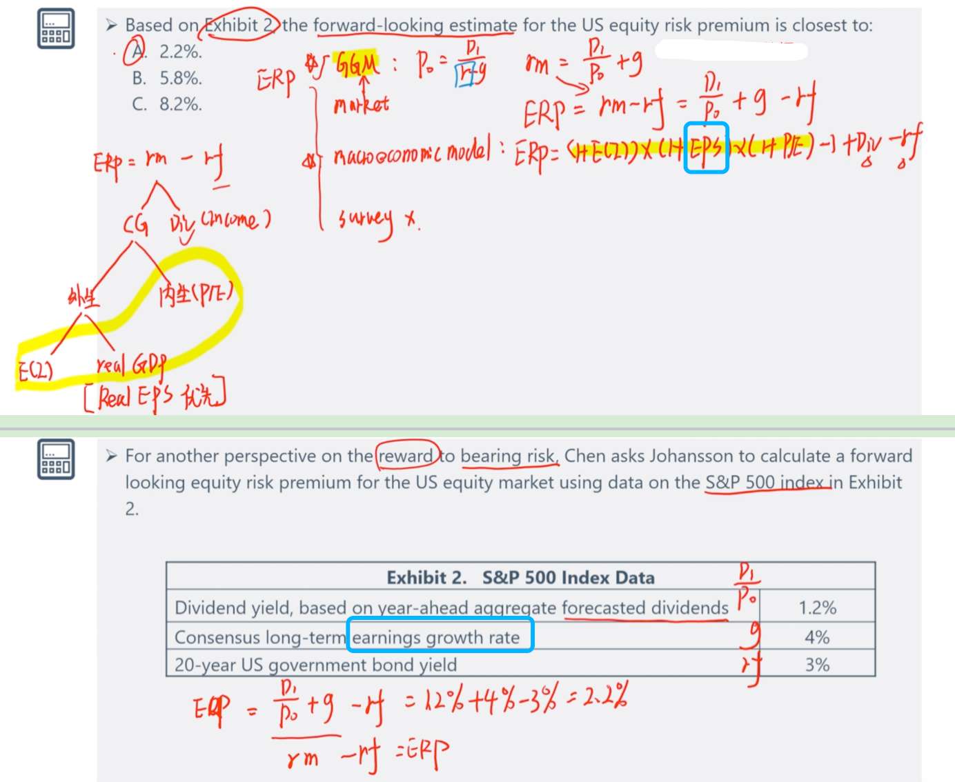 1.表格中的earnings-growth-rate和supply-side-estimate模型的EPS%是一回事儿吗,感觉没区别呢?2.GGM公式中的r不是re吗,什么时候表示rm,什么时候表示re,应该怎么区分?