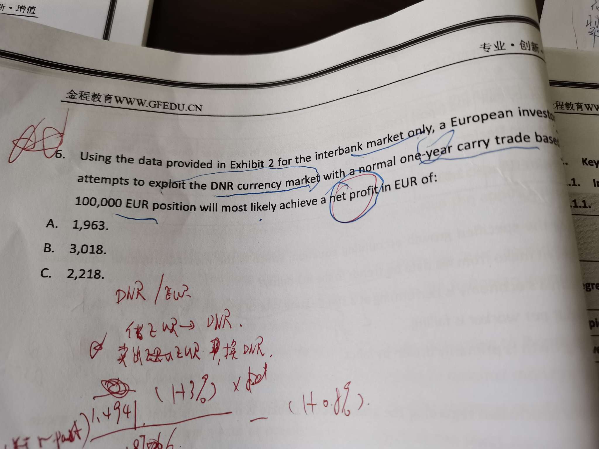 百题case8,第6题。老师的讲解有问题?题目问的是net profit,应该还有考虑进funding currency 即EUR到期汇率升水给整体profit带来的损失。老师讲题没有计入这部分由于汇率变化带来的profit变化。请老师指点一下