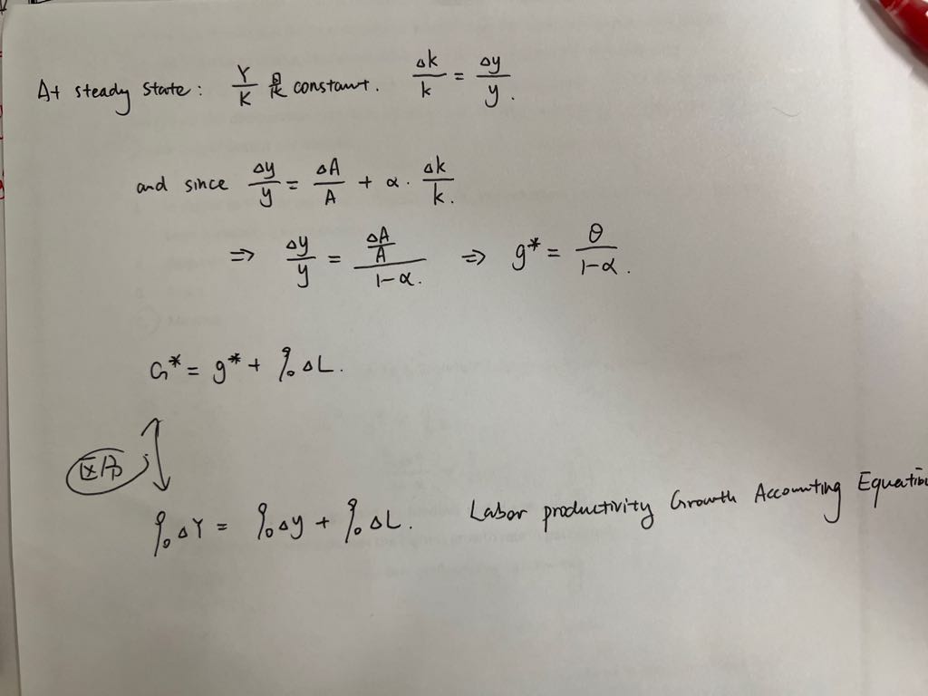 Economics百题,Case2的第二、第三问。区分一下steady state下labor productivity和output (potential GDP?)的growth,和正常情况下这两个的growth。 第二问问的是steady state下,Y和K比例确定、y和k增长率相同,所以通过growth in y = growth in A + alpha* growth in k,得出steady state下growth of labor productivity y = growth rate of A / (1-alpha)。然后所以steady state下 growth rate of Y = growth of y + growth of L(从labor productity growth accounting得来) 然后在steady state下,管growth rate y叫g,growth rate of Y叫G,growth rate A叫theta。 但我第二问比较模糊的点在于,题目都给了long-term growth rate of labor productivity (y),但我们在算steady state的时候就不能用long-term的对吧?要自己算g那个公式。 然后最后G=g+growth in labor其实和 第三问的labor productivity growth accounting是一个公式,只不过G和g是在steady state下? 就是我感觉这两个其实是一个公式,第二问差点直接用long-term growth in y,然后发现第三问该用,第二问steady state要自己算?