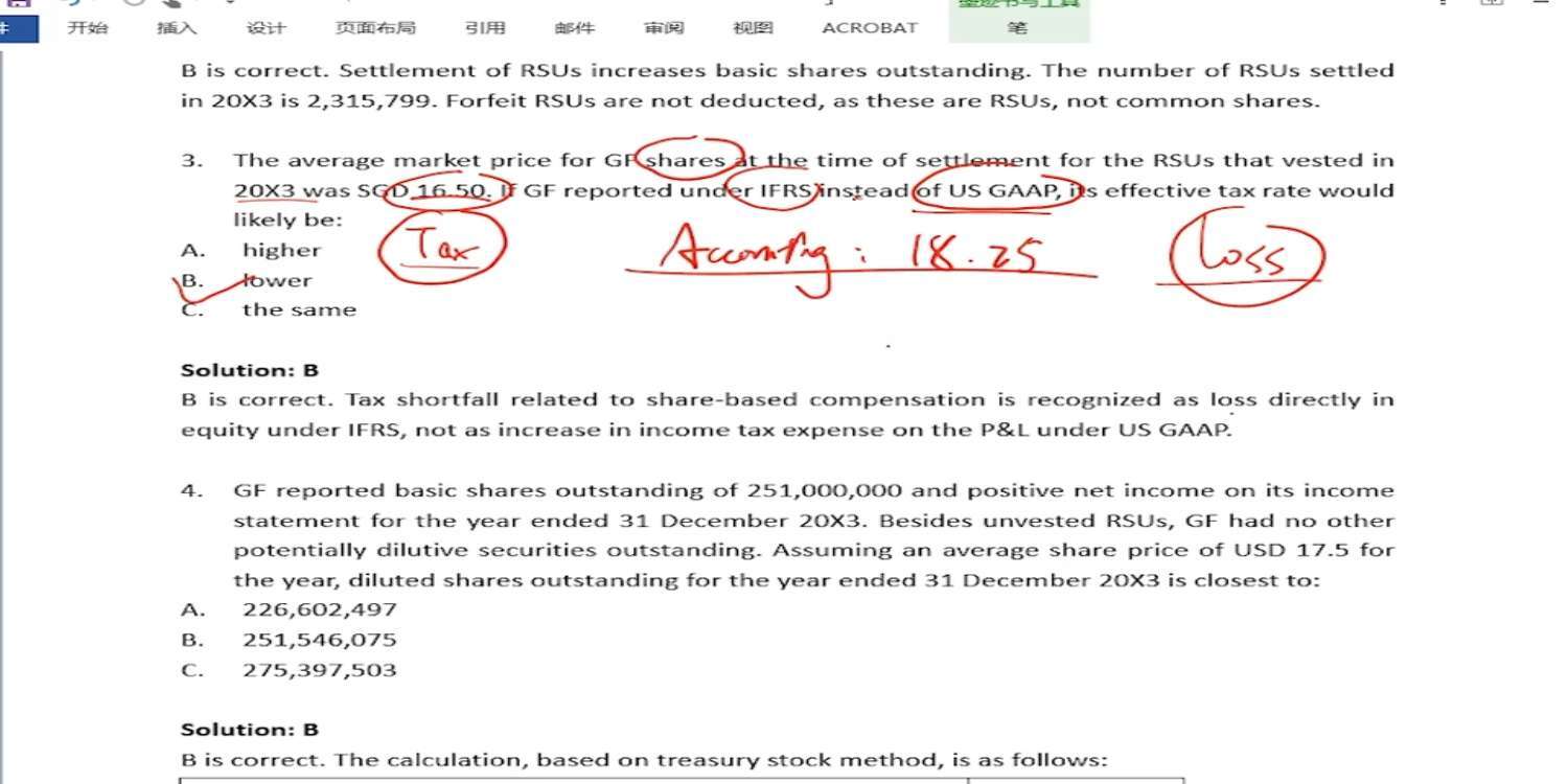 查看试题 已回答Q3不是很明白,能讲一下会计记账流程和税务记账流程么?我的理解是:20X3年,在会计科目中,Operation Expense是等于按照granted date的股价计算Vest Value - Forfeited Value。而在税务中,该Expense按照vest date时的股价计算,然后在IFRS下计入Equity,在US GAAP下计入I/S。那US GAAP来说,我所困惑的点是:1)讲义上说是差值,那如果是差值计入I/S,那US GAAP不会由于grant date 和 vesting date的股票差异出现税务差异。 2)为什么是差值,剩下的钱计入哪里了呢?