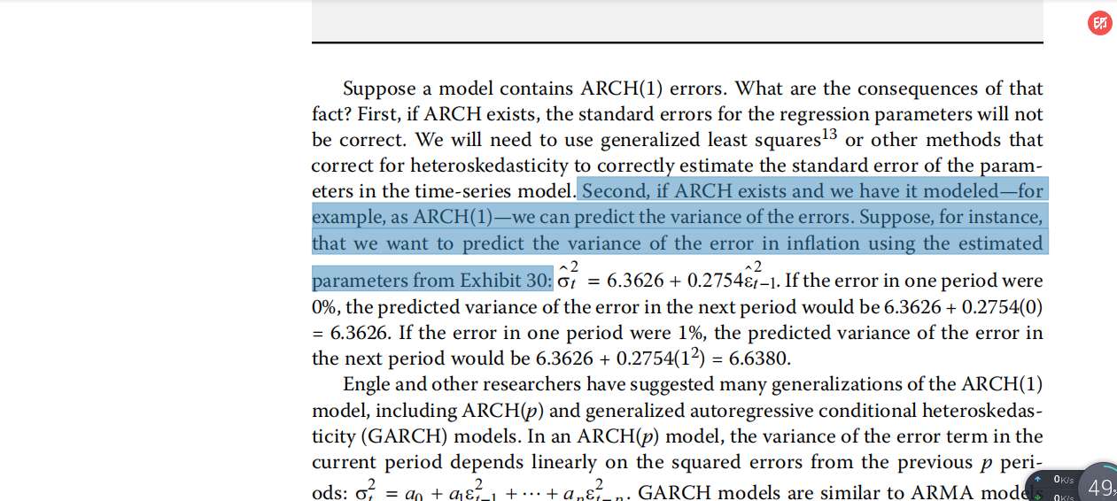 书上第216页,选中这里讲的是当有ARCH时的后果的第二点,可以预测残差的方差,请问老师,这里预测残差的方差有什么意义呢?