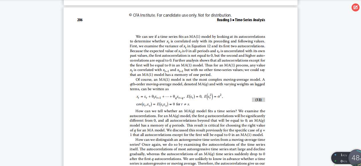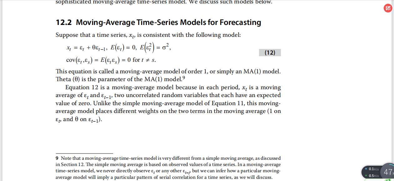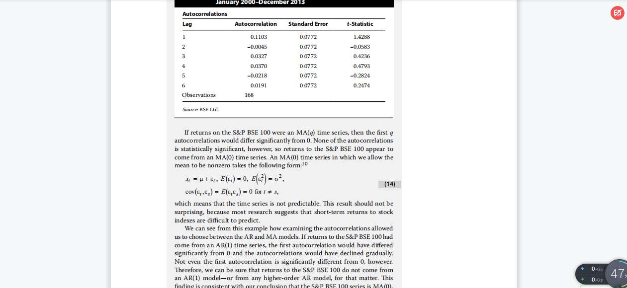 书上第205开始讲的MA model,我在咱们出的冲刺笔记的书里没有找到这部分内容,有点看不太明白。1、请问是冲刺笔记里面没有这部分吗?或者网校老师有讲解吗?整个MA model都没太看明白2、另外,这里举的例子也没太看明白,这里是分别滞后1、、、6项做相关性分析,t-statistic都小于了关键值,说明都不能拒绝原假设,也就是说系数都为0,为什么就MA(0)了呢?如果有一个或两个的滞后项是显著的,那应该是什么?