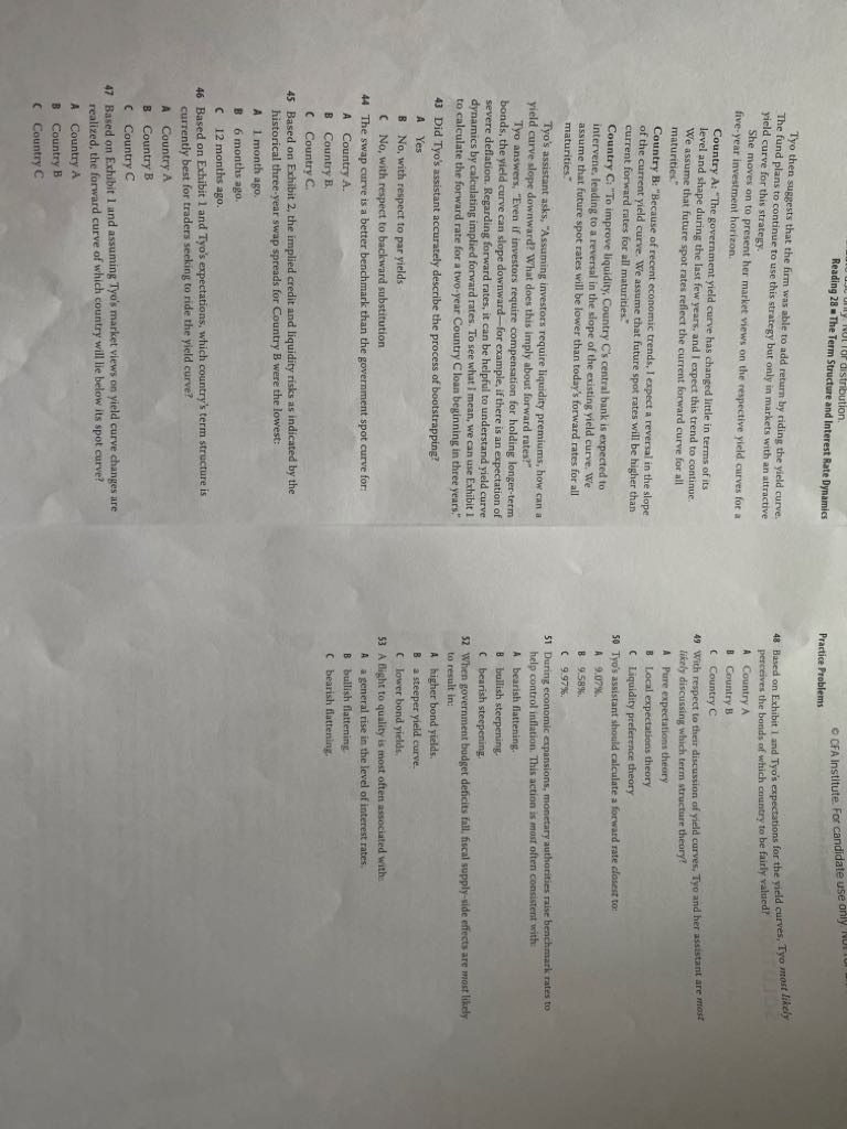 R28 利率期限结构 1. 第46 题 如果没有A 选B可以么?我看讲义上也没要求必须都是正的?2. 第49题 从原文中如何理解? 3. 第51题 如何判断是牛熊?4. 第52题 参考图二 关于赤字上升的笔记“需求多,供给多,债券价格下降,收益率也上涨”,记得对的?所以52题 选高收益率?5. 第53题 如何判断牛熊? 6. 第36题 这道题是考通过swap rate 算return么?7. 第32题 如何判断高低估,s小于f 价格未来不应该是上升么? 以哪个为标准来比较?