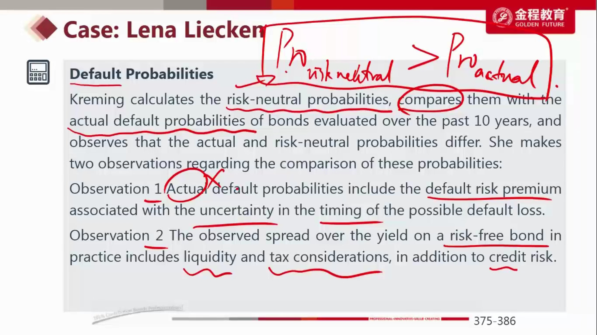 第1句话正确的说法是实际的违约风险不包括与时间不确定性的违约风险,这话是什么意思呢?搞不明白,实际的违约风险的时间不确定性是个什么鬼??? 第2句话说观察到的 Spread,这与实际的违约风险和中性的违约风险又有什么关系呢? 迷瞪瞪的。