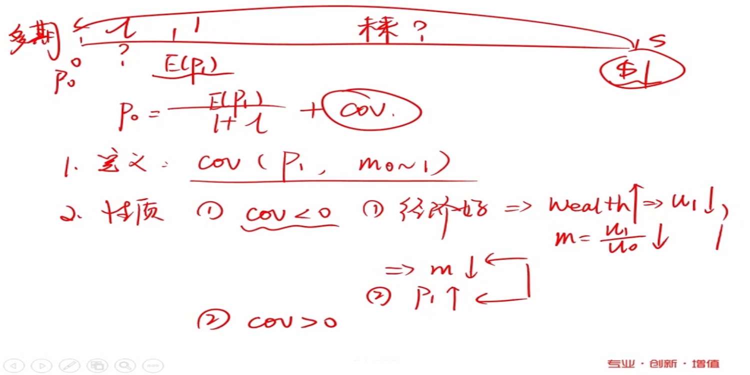 老师好,这个cov(p1,m)负相关可以从另一个角度理解吗?按照从1期的跨期替代率学到的知识理解,0-1时间段经济好,m下降,收益率L高,所以P1高,所以cov<0, 没有从老师讲的wealth的角度理解,这样理解可以吗?