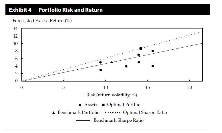 已回答对这个图的内容有些疑问。这个图的Optimal Sharp ratio就是用bench mark的组合,达到的最优组合,实线上是benchmark的SR,原点是没有充分分散的,只有方块是充分分散的吧。比如优化benchmark的组合,相当于从实现跳到了虚线,虽然IR达到了最优,但是从tracking error并没有那些围绕基准近的组合好。 那如何目的要基于基准的投资,那到底是要原点这些没有全分散的tracking error好的组合,还是落在最优SR上的组合?