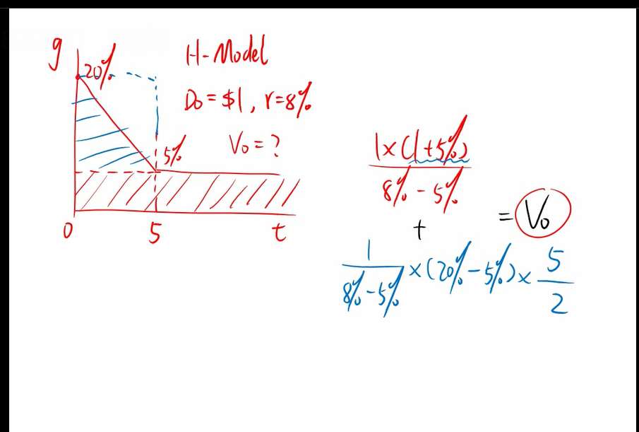 在H model中如果看成两阶段模型,0-5年的增长不应该是永续增长,所以为什么折现率没有用Re反而是用的永续增长中的r-g呢?