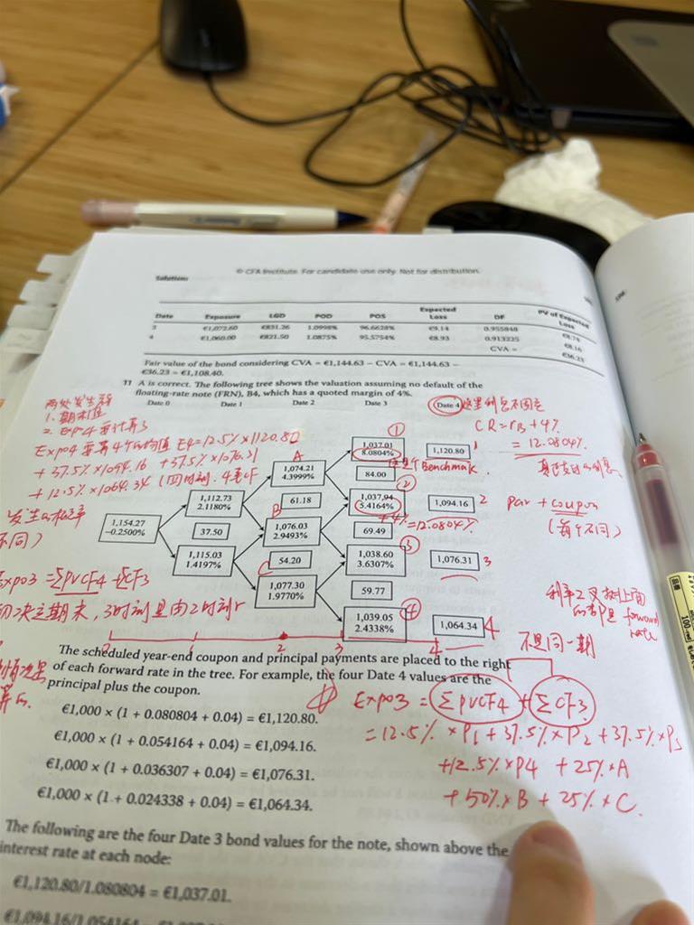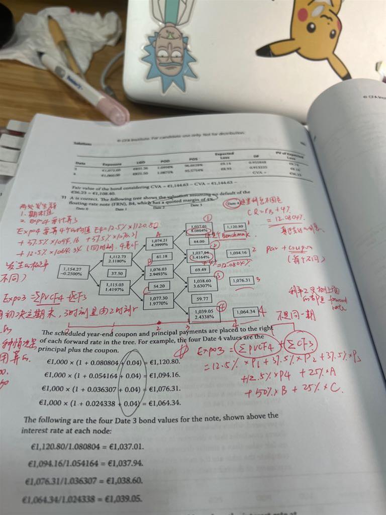 已回答想问下reading31 课后题11 Exposure下标的问题,CF(coupon部分)为什么标的是3,PVCF标的是4呢,coupon那边是因为二叉树上都是forward rate吗?PVcF那边是因为从后往前折?(先用date3时间点算date4的浮动coupon值,然后再用二叉树框框里的折现率,比如第一个空8.07%)折到3时间点?