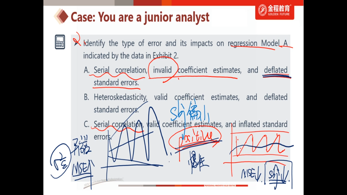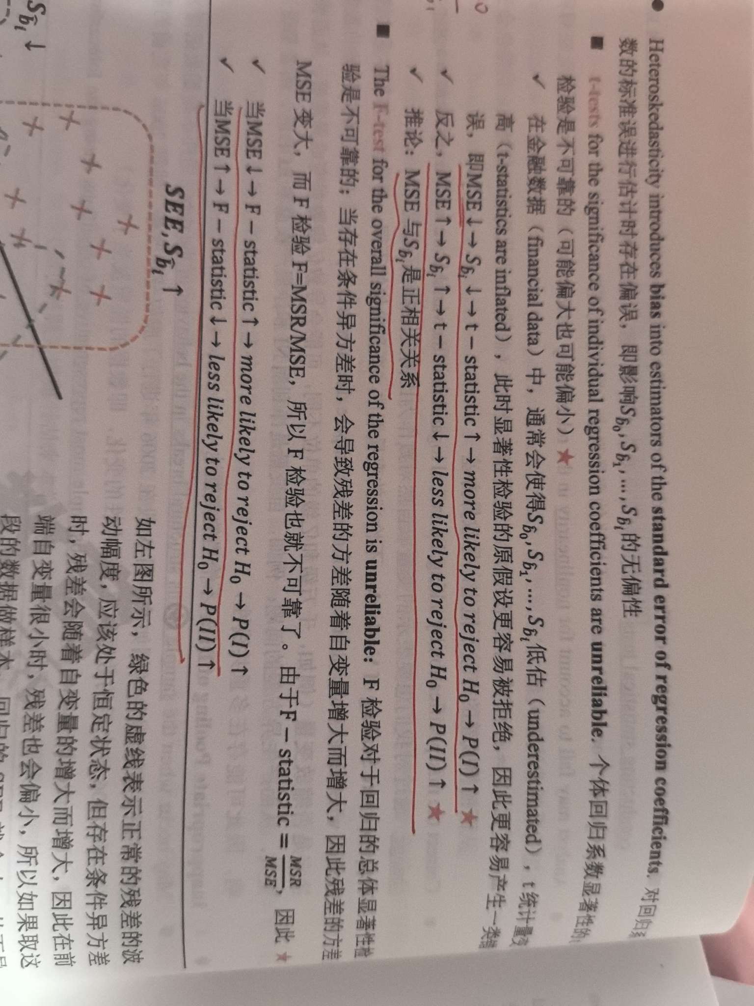 查看试题 已回答这里提到异方差的情况下MSE增大,标准误是减小的。可是在强化班的视频里,老师在介绍用t-test检验异方差的时候说:MSE增大,标准误增大,TS减小,易取伪,所以二类错误增加。同样是MSE变大,一个地方说标准误减小,一个说增大。可以解释一下吗?