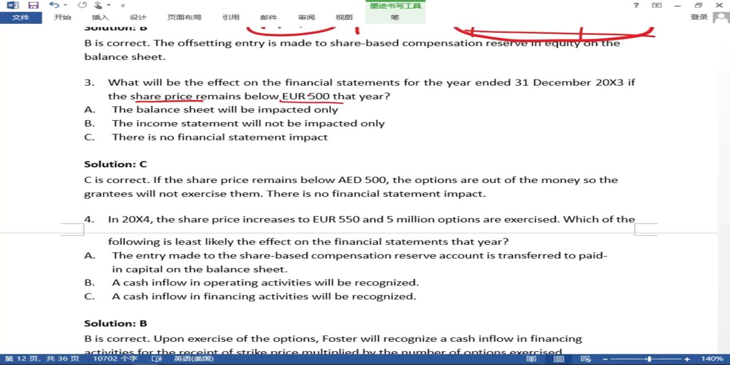 老师好,这个第3题答案是C对财报没有影响,但是强化课时老师讲过,股票价格升高,期权价值升高,expense 升高,NI下降,那么现在股票价格下降了,期权价值应该下降吧,expense 应该下降吧,NI升高,这是对I/S 有影响了吧?是我记混了么?