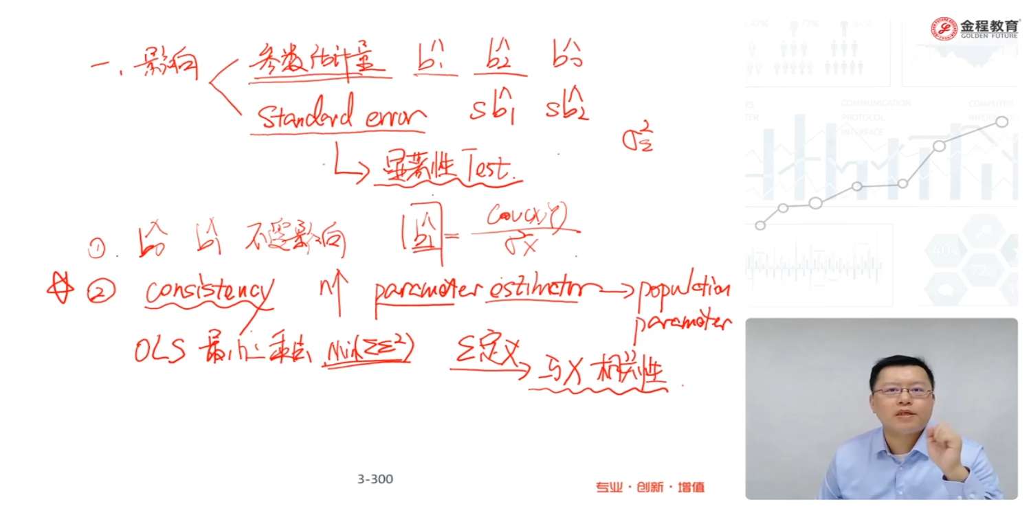 老师说:1. Consistency因为用了OLS方法,所以如果残差与X有相关性,会导致残差定义不准确,最终导致不符合consistency。简言之,就是如果残差与X有相关性,会导致不符合consistency。2. Conditional heteroskedasticity指的就是 残差与X相关。为什么还符合consistency呢?