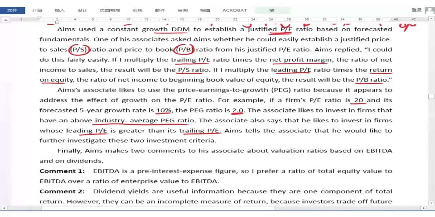 老师好,本case 第一题和第二题,一起看,第一题用的是forward profit margin, 求的justified P/S, 那是不是可以说它用的是leading P/E ratio 乘以net profit margin呢,因为它的算法是P0/S1 乘以E1/S1。 咱们再看第二题,第二题说的是‘multiply the trailing P/E ratio times the net profit margin’,而且老师讲的也是用P0/E0乘以E0/S0, 那么我可以认为justified P/S 既可以用P0/S0也可以用P0/S1做吗?