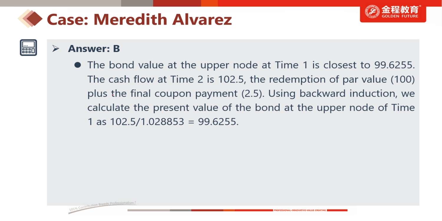 连接time 1的upper node的有time2的两个点,应该是两个值折现后的加权平均,那么为什么不是1/2*(102.5/1.027183+102.5/1.016487)/(1.028853)的计算方法?前一道Betty Tatton题目的类似计算就是1/2*(102.5/1.027183+102.5/1.016487)/(1.028853)的思路(我的理解),这里为什么这么计算?