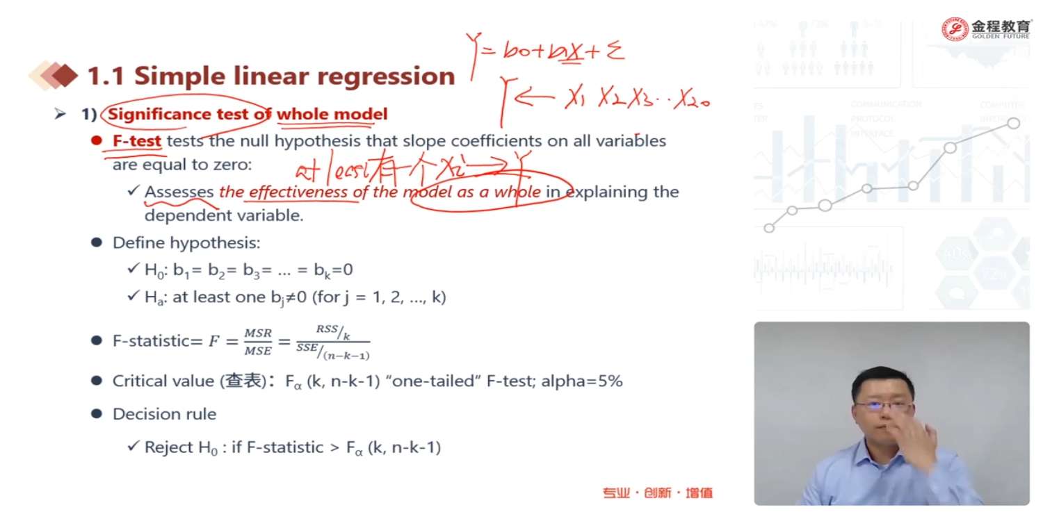 57:55,用F-test检验整个regression,如果具有显著性,是不是等同于:把regression中的每个coefficient做显著性检验,至少有一个coefficient是有显著性的?