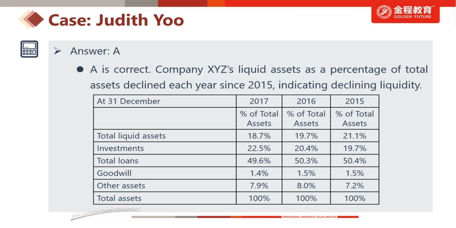 1.老师能否从字面读题翻译和字面阅读理解的角度讲一下这问的是什么意思,而不是知道答案带着答案推的思路来讲。这题的难点在于它的表述难以理解。2.答案的解释里写Impaired assets have decreased each year while strong credit quality assets have increased each year, which suggests lowering impairment allowances as a result of improving credit quality of these financial instruments. 也难以理解其意,烦请老师指点迷津!