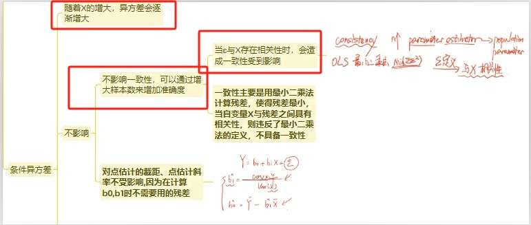 如图,随着X的增大,异方差会逐渐增大,能说明X与残差项之间存在相关性?这里是否可以这样理解:当X增大,出现条件异方差时,可能存在以下几种情况①遗失了重要变量X2被包含在残差项当中,但是不代表X1与残差项之间存在相关性,这里遗失的变量X2与现有的变量X1 cov(X1,X2) = 0,仅是b0估计不准确,在这种情况下,仅会出现序列自相关问题,不影响一致性,;②如果遗失的变量X2被包含在残差项当中,但是cov(X1,X2)≠0,说明X1,X2存在相关性,这里就会导致b0,b1估计不准确则会影响一致性。①②理解是否正确?