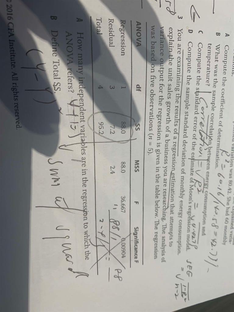 已回答图中TSS为95.2,为什么sample variance of dependent variable 是TSS/total df=95.2/4=23.8而不是TSS/total observation=95.5/5=19.1?谢谢