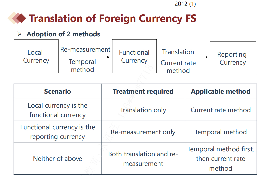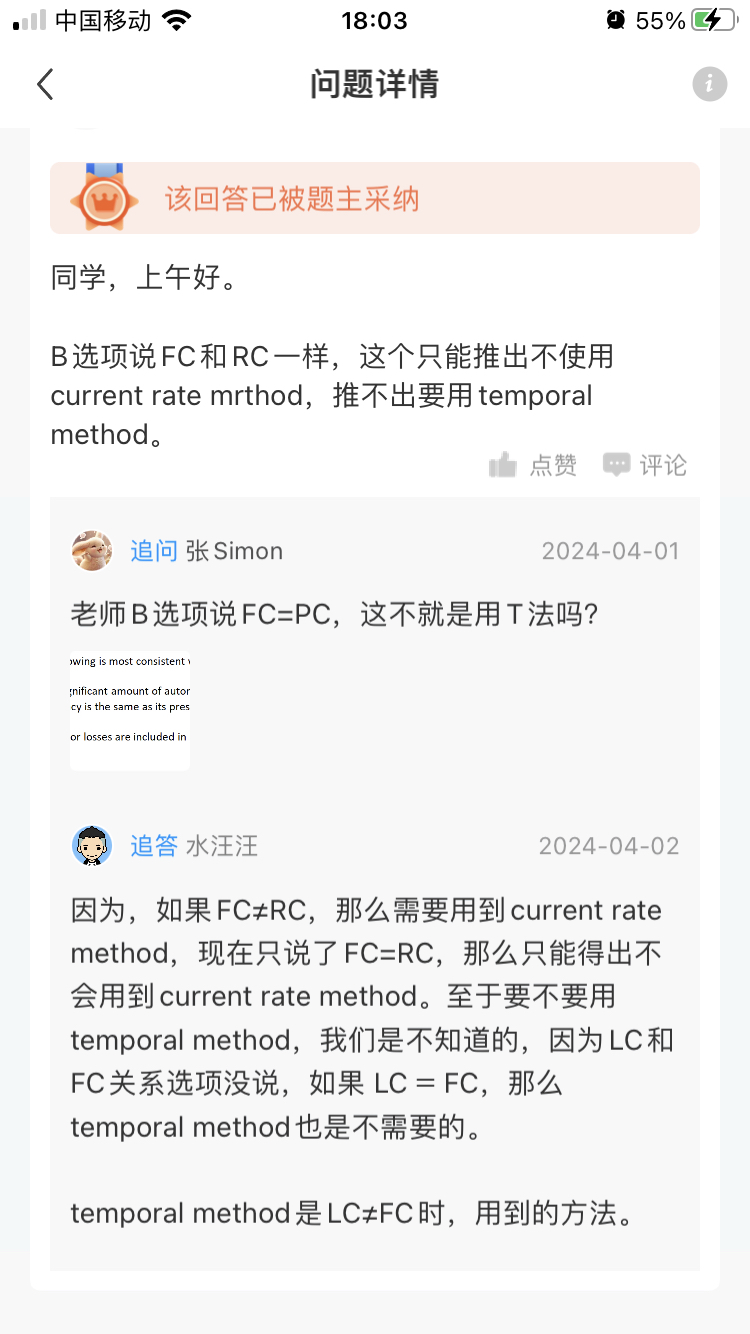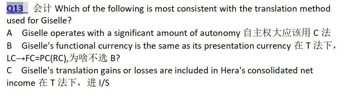 会计强化P67,因为,如果FC≠RC,那么需要用到current rate method,现在只说了FC=RC,那么只能得出不会用到current rate method。至于要不要用temporal method,我们是不知道的,因为LC和FC关系选项没说,如果 LC=FC,那么temporal method也是不需要的。 temporal method是LC≠FC时,用到的方法。