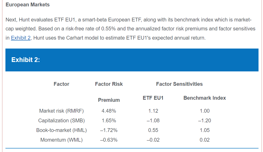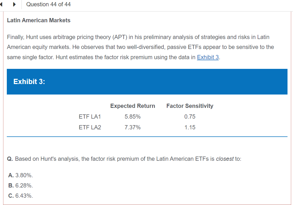 组合,MA2-Q44 Based on Hunt's analysis, the factor risk premium of the Latin American ETFs is closest to: