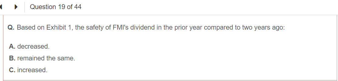 公司金融,MA2-Q19 Based on Exhibit 1, the safety of FMI's dividend in the prior year compared to two years ago: