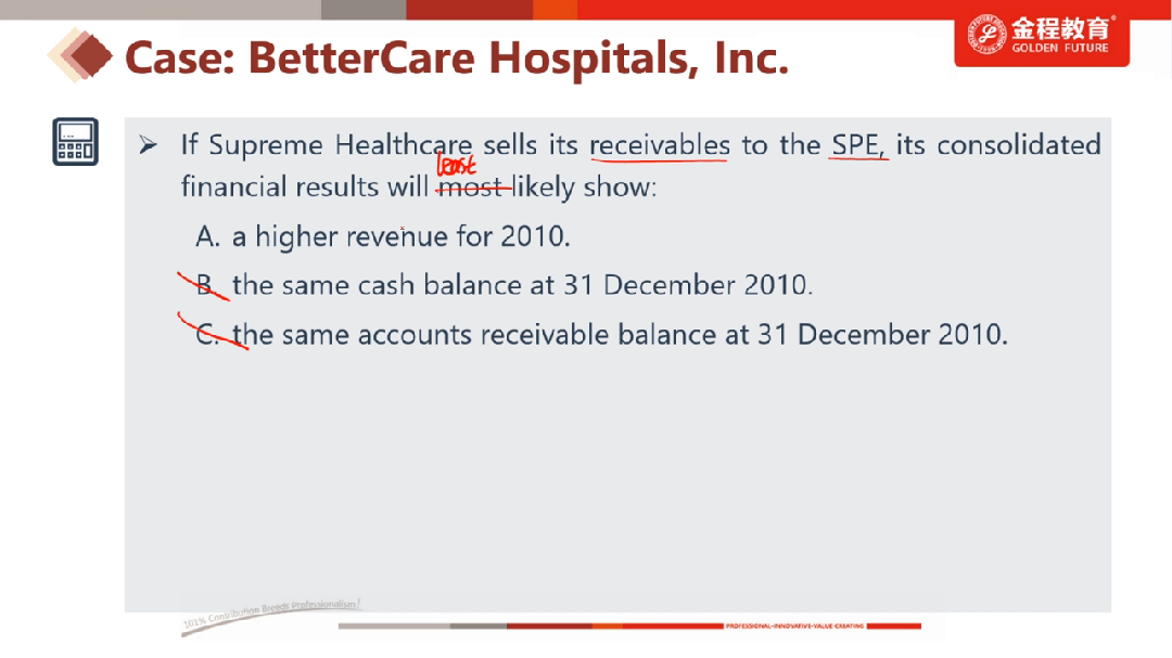 请问老师,这题里面C为什么是对的呢?我的理解是:虽然SPE要跟SH公司并表,但SPE买了SH公司的应收账款后SPE的cash减少,同时投资性资产增加,SH公司把应收账款卖给SPE后cash增加,同时应收账款减少,那并表后资产端cash没变化,但应收账款没了,变为了投资性资产。我以上理解不正确吗?还是说SPE买了SH的应收账款后在它的资产负债表上还是体现为应收账款呢?