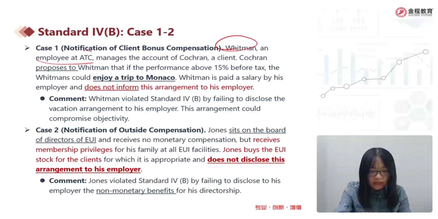 1. case 1, 分析师接受客户的礼物,不是收只能在一般客户眼中适中的礼物吗,这个免费旅游即使披露了也得到雇主同意,是不是 不违反Ⅳ(B)additional compensation,但是违反Ⅰ(B)independence and objectivity ? 2.违反Ⅳ(B), Ⅳ(C) 就违反了 Ⅳ(A) ?