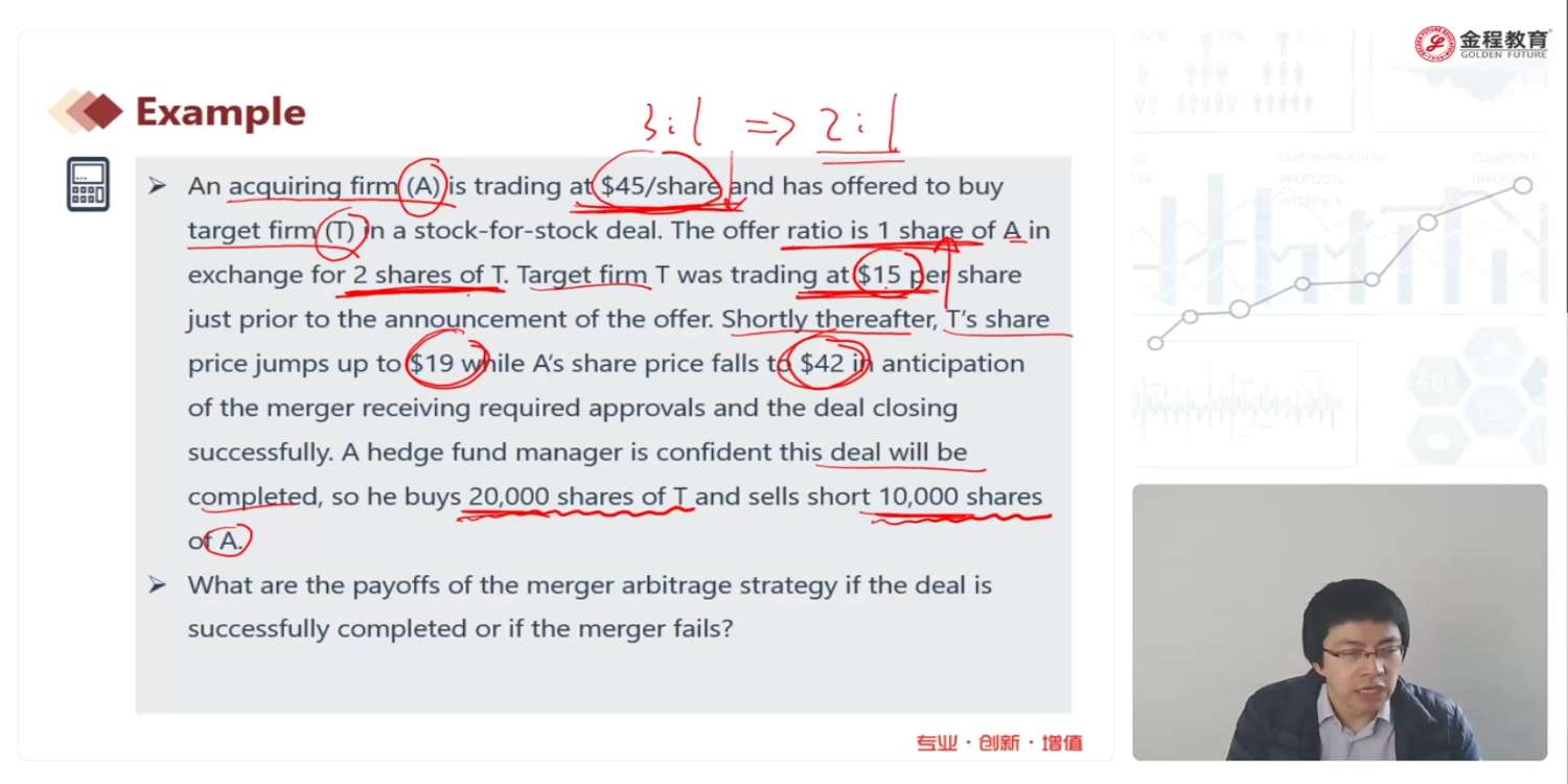 老师问两个问题:1. 股价为什么会按收购的2:1靠近? 2. 20,000 shares of T和10,000 shares of A如果收购成功是怎么自动平掉的?算payoff为什么不需要用到收购后的股价去计算(如收购后变成$20,$40)?