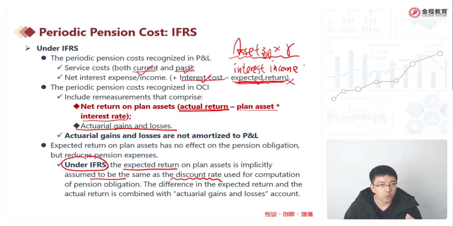 interest cost - expected return 进利润表,actuarial return - plan asset * interest rate进OCI ,这两个不是一样的?actuarial return 和 expected return有什么区别?②在ifrs下利润表的interest income/loss 用的是市场利率,那为什么又会出现actuarial return?