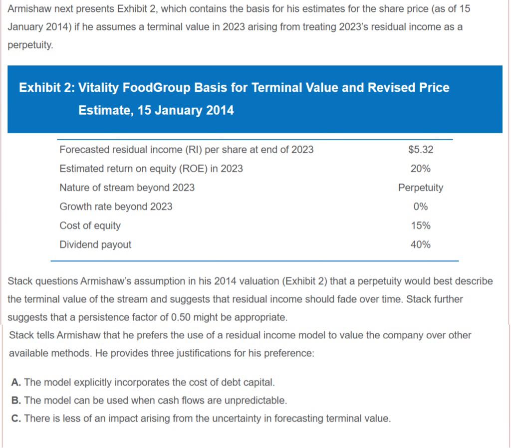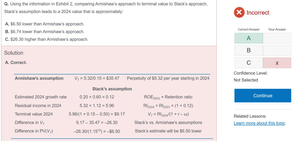 权益,RI,第31题,老师 1、Armishaw假设2023年后的RI不变,当做永续年金,因此可以计算出此种情况下RI在2024年的现值,也就是解析中第一个计算式子。Vt=RI2023/r,