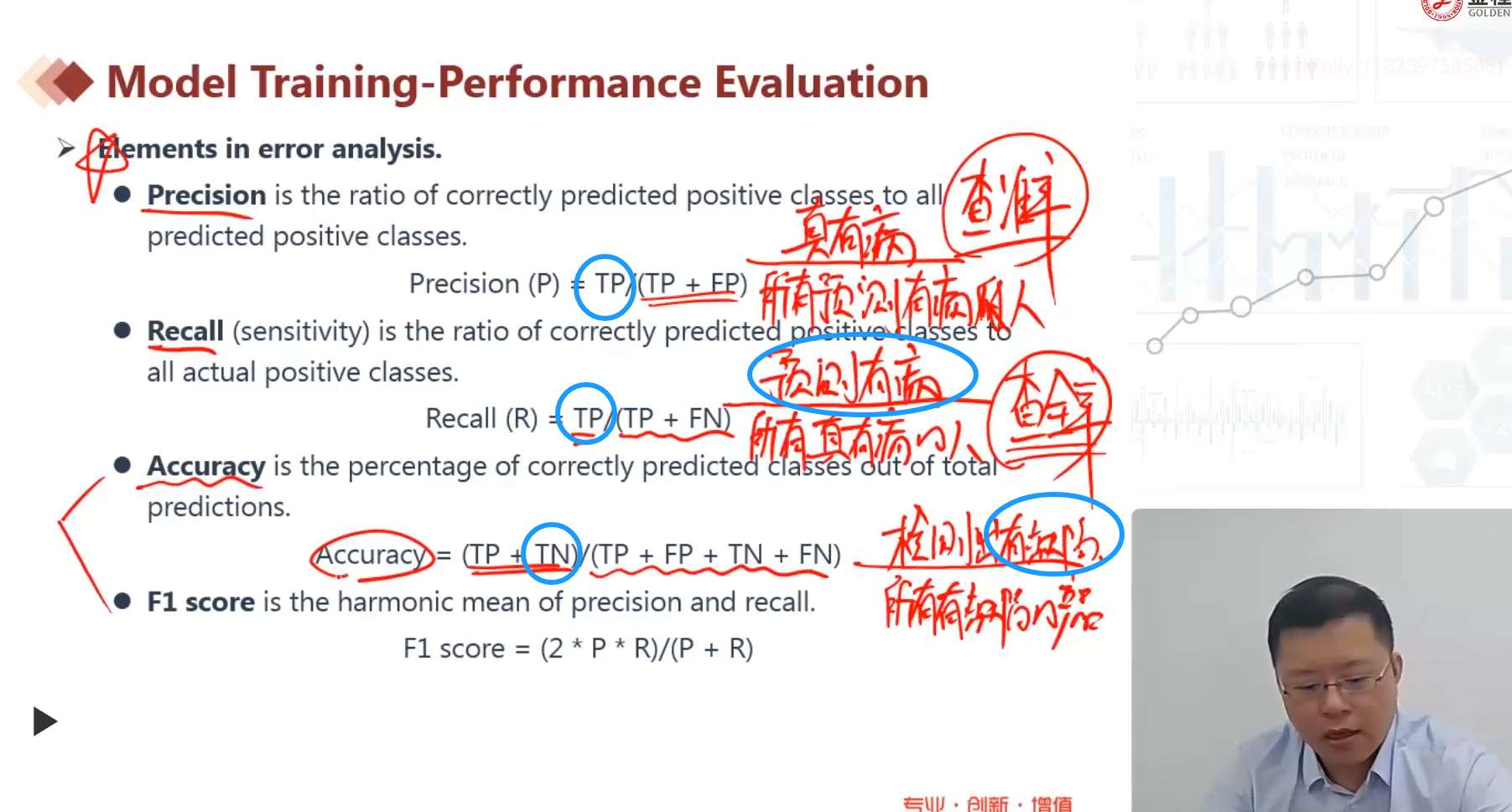 老师这两个地方讲错了吧(蓝框)。1)查全率和查准率的的分子都是TP,是真有病的人(预测对且实际也对)。而老师讲查全率分子是预测有病的人,那也可能出现预测有病但实际没病的。所以既然分子都是TP,中文表述和英文表述不都应该一样吗? 2)准确率的分子是TP+TN,是正确预测的情况。也就是正确预测有病和正确预测没病。而老师说检测出有缺陷,不对吧。TN是正确预测没病啊。烦请老师们再确认下吧免得误导。