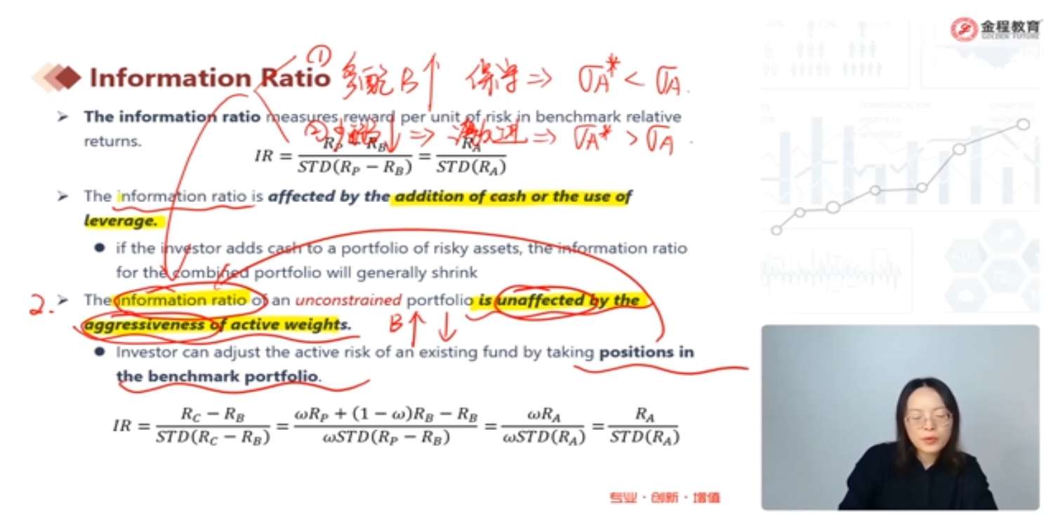 对于夏普比率来说:1. 多配或少配cash,夏普比率不受影响;2. 多配/少配risky asset,volatility会上升/下降,对应的夏普比率会上升/下降。对于信息比率来说:1. 多配/少配benchmark,IR不受影响;2. 多配/少配cash,IR会下降/上升。总结的对吗?