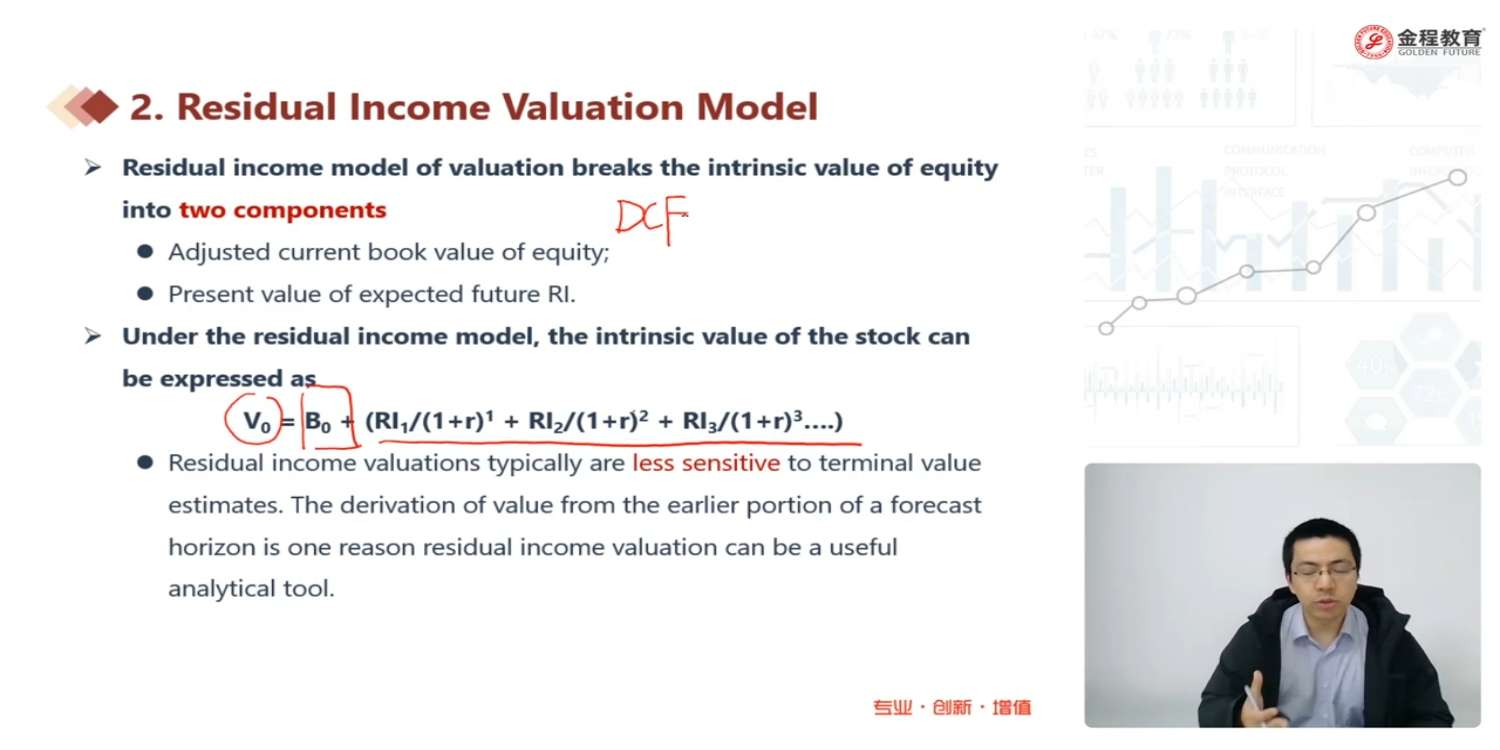 这里有个疑问,为什么后面是RI1/(1+r)+RI2/(1+r)^2·····,不是单独的一项RI/(1+r)?假设公司第一年的RI1,在第二年年末的时候RI2应该会包含RI1中的部分(例如,RI1+NI-DIV=RI2)