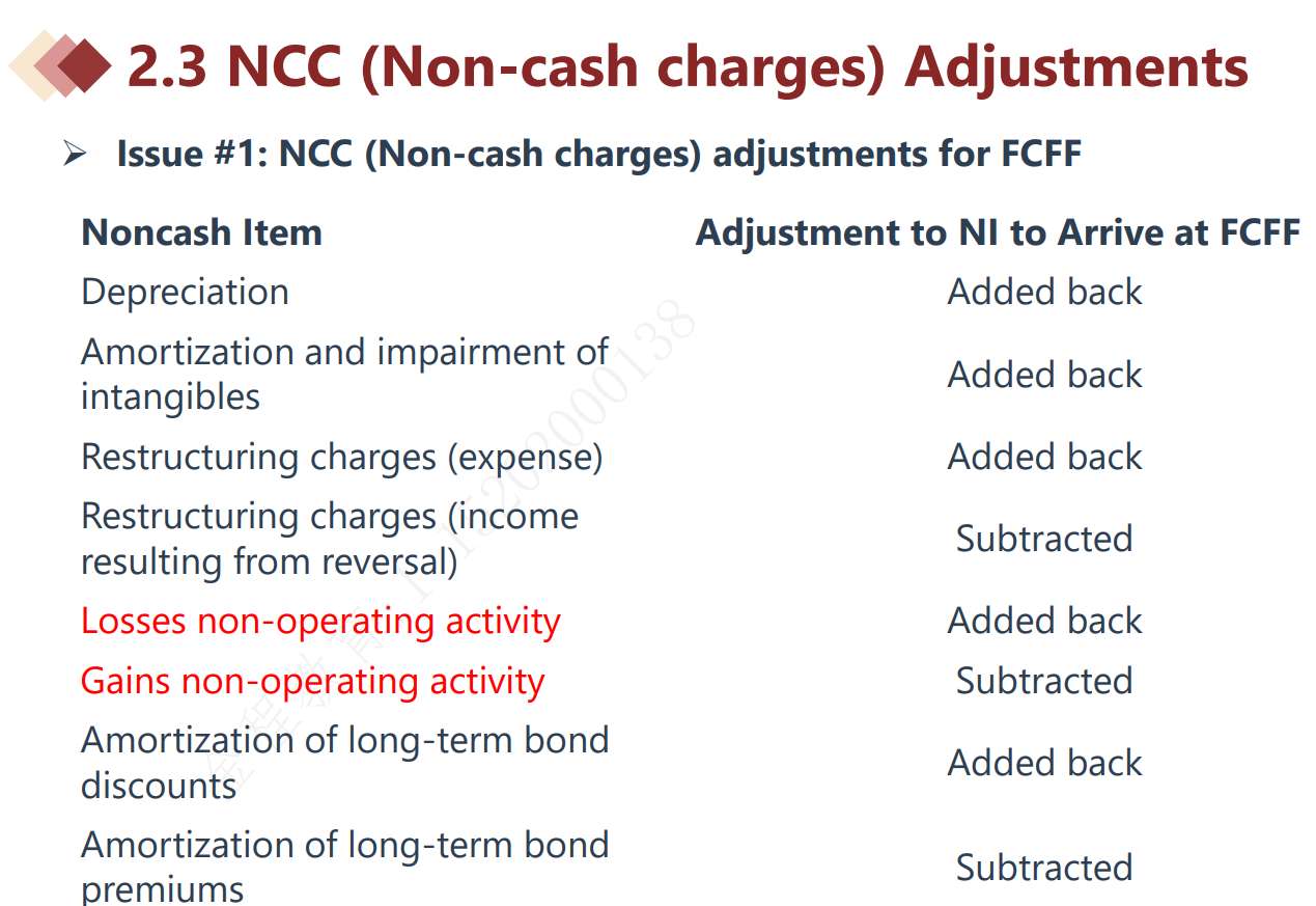 您好,1.在计算after tax operating cash flow, ATCFO= NI +NCC -dividend paid, 这里NCC是不是也和计算FCFF的NCC一样?;2.disposal gross value, 是怎么来的?和disposal NBV的区别是什么;3.计算FC Inv=capex - cash received from selling LT asset, (1)如果公司是生产机器设备的长期资产,是不是把这种产品销售排除在FC Inv?, (2)卖出长期资产如果收到的不是现金而是是A/R,是不是也计算在内,从长期(→FCFF)来看终将收到这笔款项?