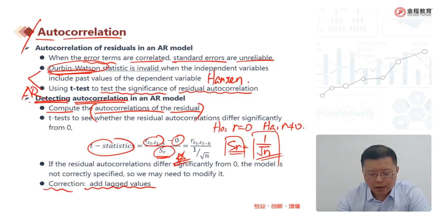 数量对应资料中PPT与课程讲解PPT不一致,多页缺少部分内容或存在图片遮挡,例如:(1)本页资料PPT无“Correction: add lagged value”;(2)资料PPT中Learning Module 3中Serial correlation部分effect of serial correlation内容被图片遮挡了最下方几行。