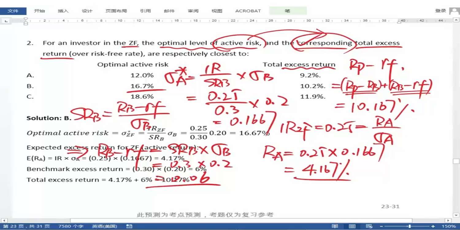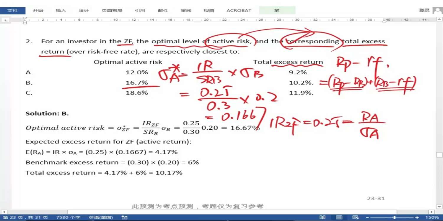 第2问,最优的主动风险不是组合的吗,不是ZF的吧。在求Ra的时候,应该*ZF组合的主动风险,而不是组合的最优主动风险16.7%把?
