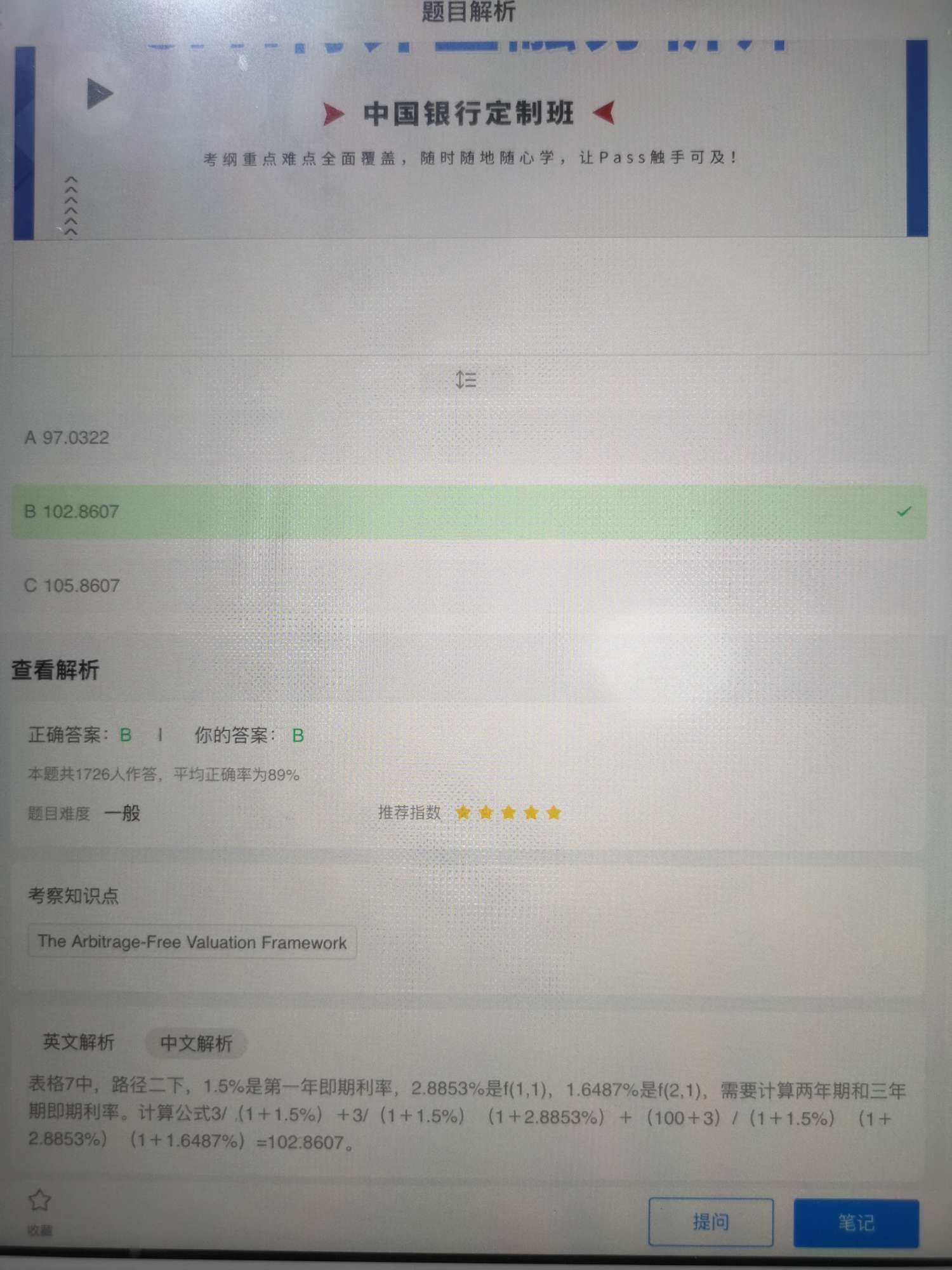 已解决为什么Q2中求债券价格不是用103/(1+1.7049%)(1+1.5019%)(1+1.25%)类似这样的折现方式,而是103/(1+1.7049%)的三次方。我记得有一道题目就是用我的思路去折现求债券价格的(我拍照上传的这张图片里的题目就是用这种思路),麻烦老师帮我解答下,谢谢!
