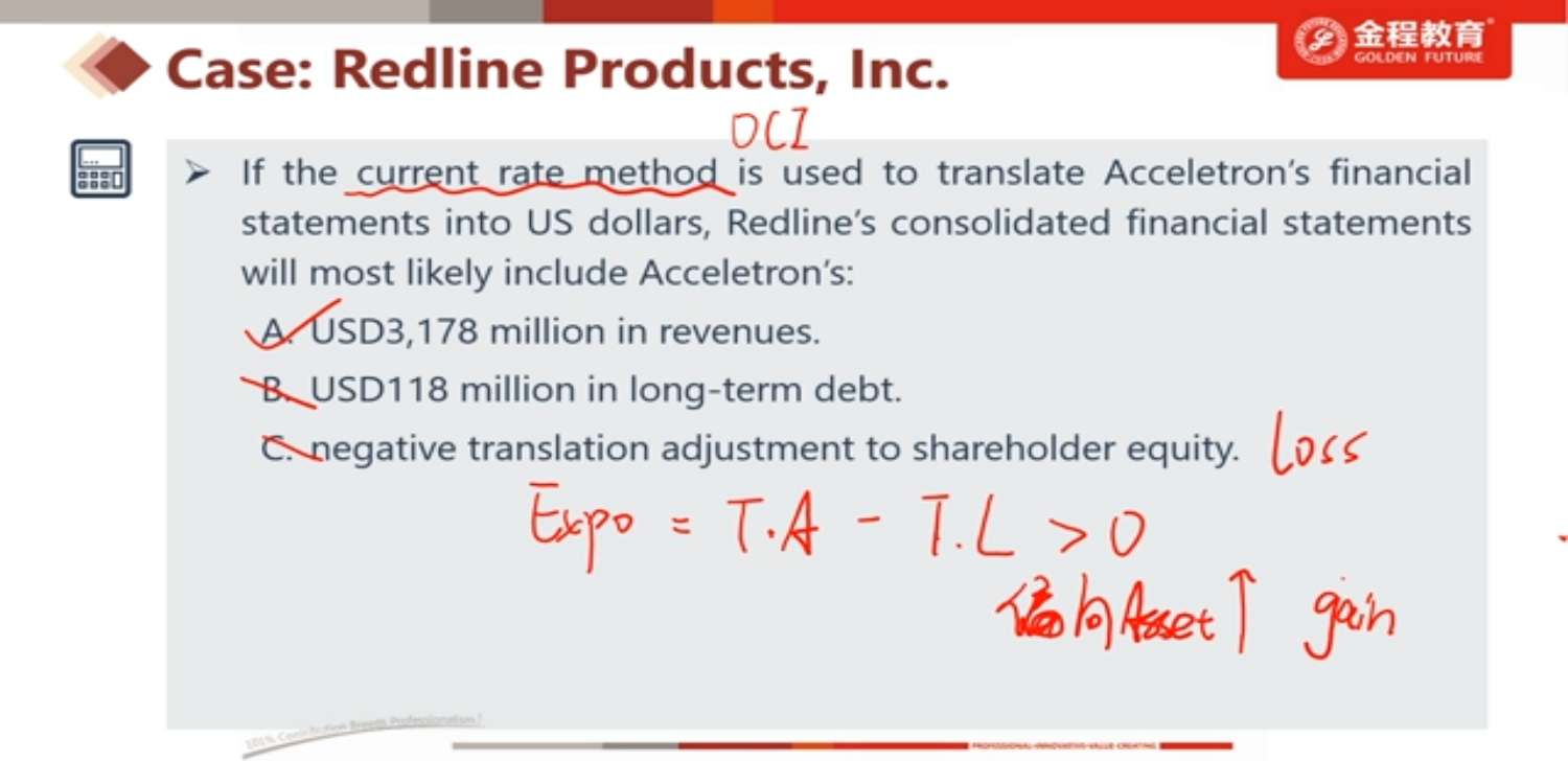 老师你好。请问这道题c选项 Exposure = T.A - T.L >0 偏向Asset. 视频中老师说因为本币升值,Asset也会升值,所以应该会为gain。那么本币升值的时候,负债不会也升值的吗?为什么只有asset会升值而判断为gain? 谢谢老师。