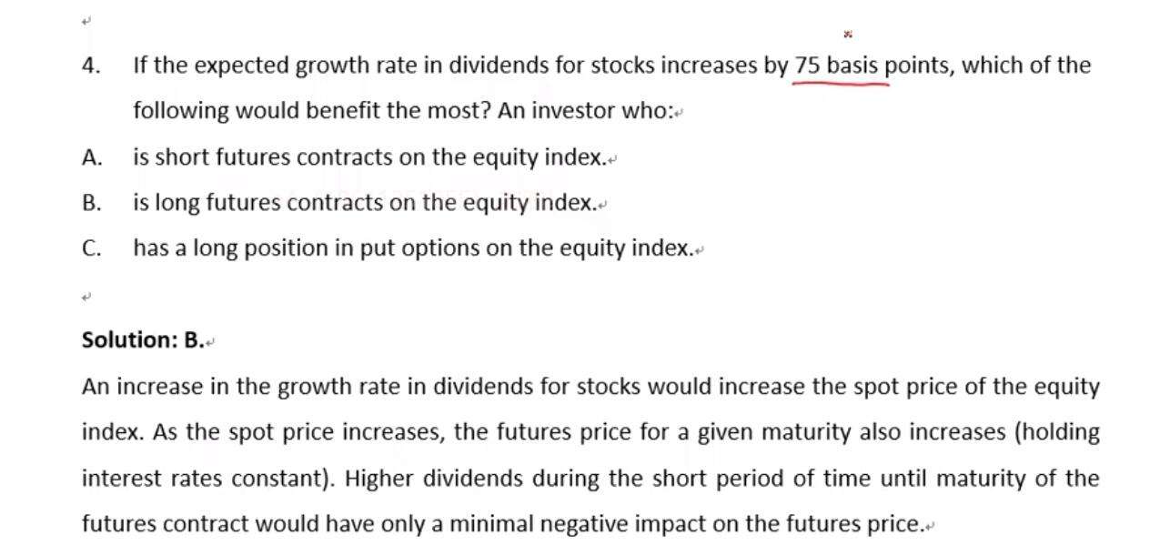 老师好,根据equity index forward contract的定价公式,股利支付率越高,FP不应该是越低吗?为啥百题里这道题,预期的股利支付增长率增加75个bp,韩老师的解题思路是期货价格会因为现货价格的增高而增高 这个思路解题。这句话我明白,但是我觉得股利支付变多,根据公式,FP应该下降啊?