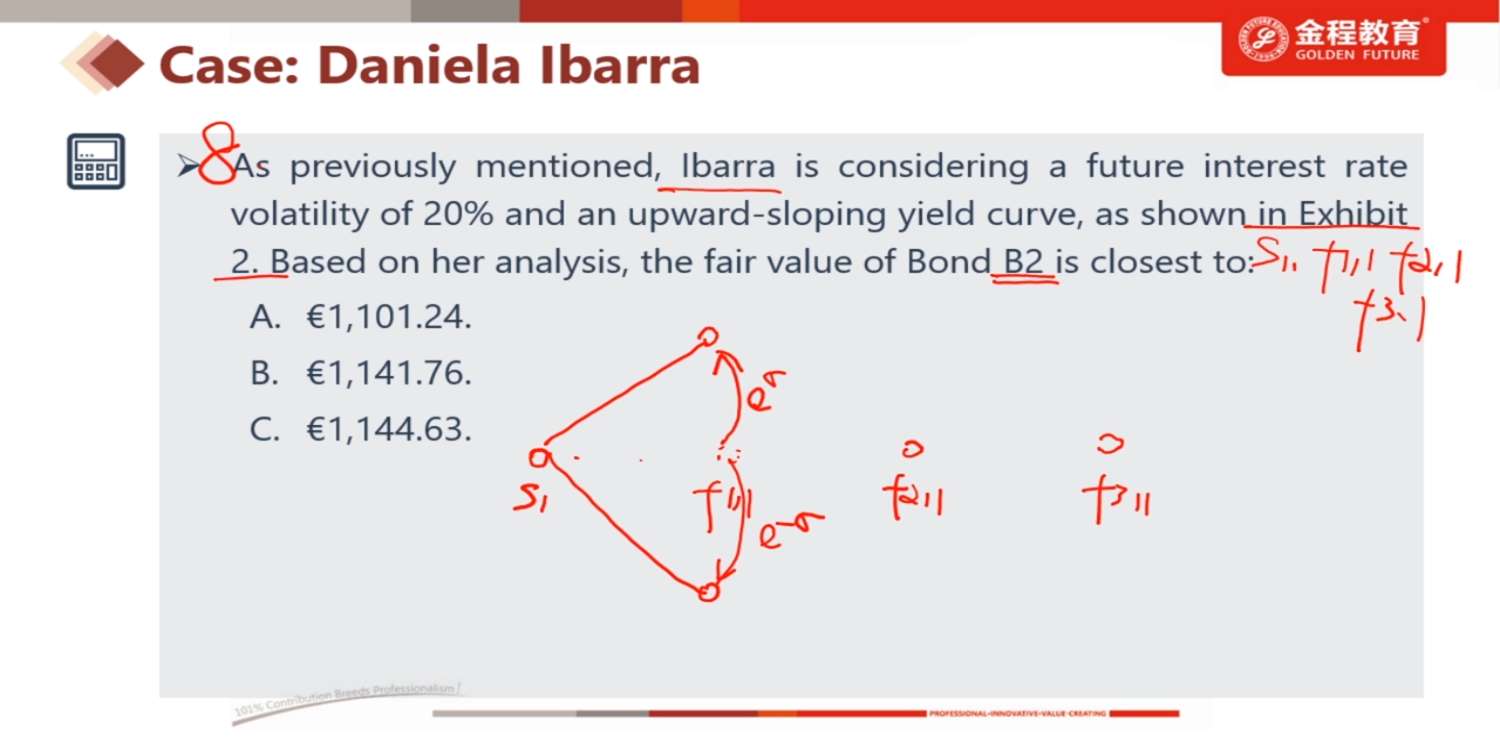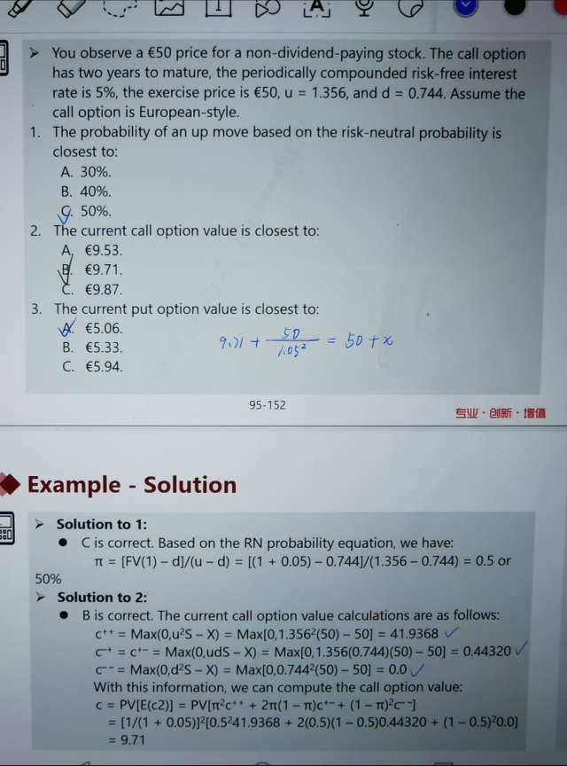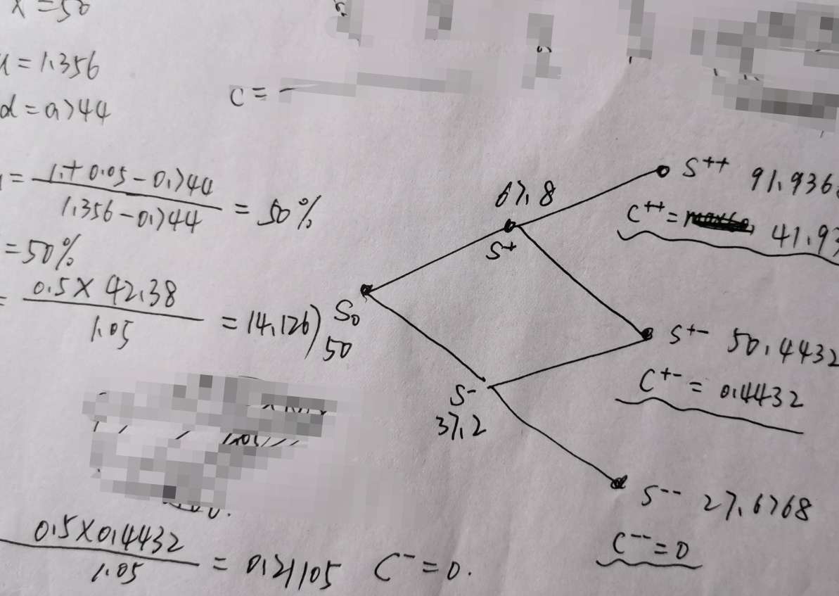 这道题算看涨期权价值,纪老师说不按照答案的思路,就按照二叉树算C+和C_,可是答案算出来等于六点多,和B不一致。