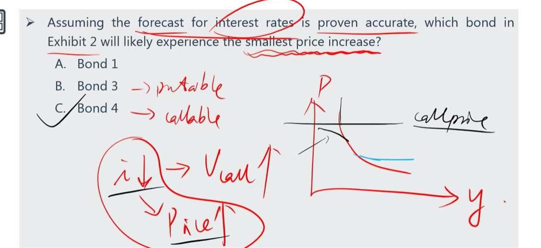 这道题为什么会选callable bond呢?V(callable bond) = V(straight) - V(call option); 而V(putable bond) = V(straight) + V(put option);当rate下降的时候, V straight的变动是一模一样的,△bond straight对消。那么剩下的比对是△V(call option)和△V(put option),这里没有经过计算,为什么说对call的影响一定大于对put的影响呢? rate下降,price上升,那么put option的value本身是下降的,那么选putable bond为什么会错呢?