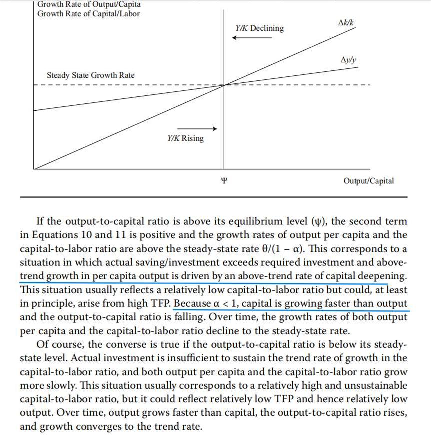 第545页,这两段讲的Y/K >和 < equilibrium level的时候,如何重归均衡。两个划线的地方没有读懂。1、y被capital deepening drive?怎么拽啊?2、为什么alpha<1,Δ%K>Δ%Y?