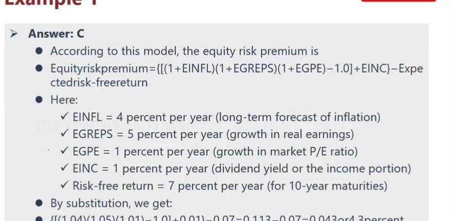 这题1年期债券为什么也要考虑inflation uncertainty? 11 A corporate bond has a remaining maturity of 1 year, has a face value of EUR100, and is currently priced at EUR90.90. The real risk-free rate is 3.25%. Inflation is expected to be 2.0% next year, and the premium required by investors for inflation uncertainty is 0.25%.The implied credit risk premium embedded in the bond’s price is best described as:A equal to (100/90.90) - 1 = 10%.B 10% reduced by the real risk-free rate and expected inflation.C 10% reduced by the real risk-free rate, expected inflation, and the premium for inflation uncertainty.